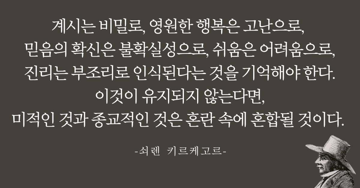 계시는 비밀로, 영원한 행복은 고난으로, 믿음의 확신은 불확실성으로, 쉬움은 어려움으로, 진리는 부조리로 인식된다는 것을 기억해야 한다. 이것이 유지되지 않는다면, 미적인 것과 종교적인 것은 혼란 속에 혼합될 것이다.[1]