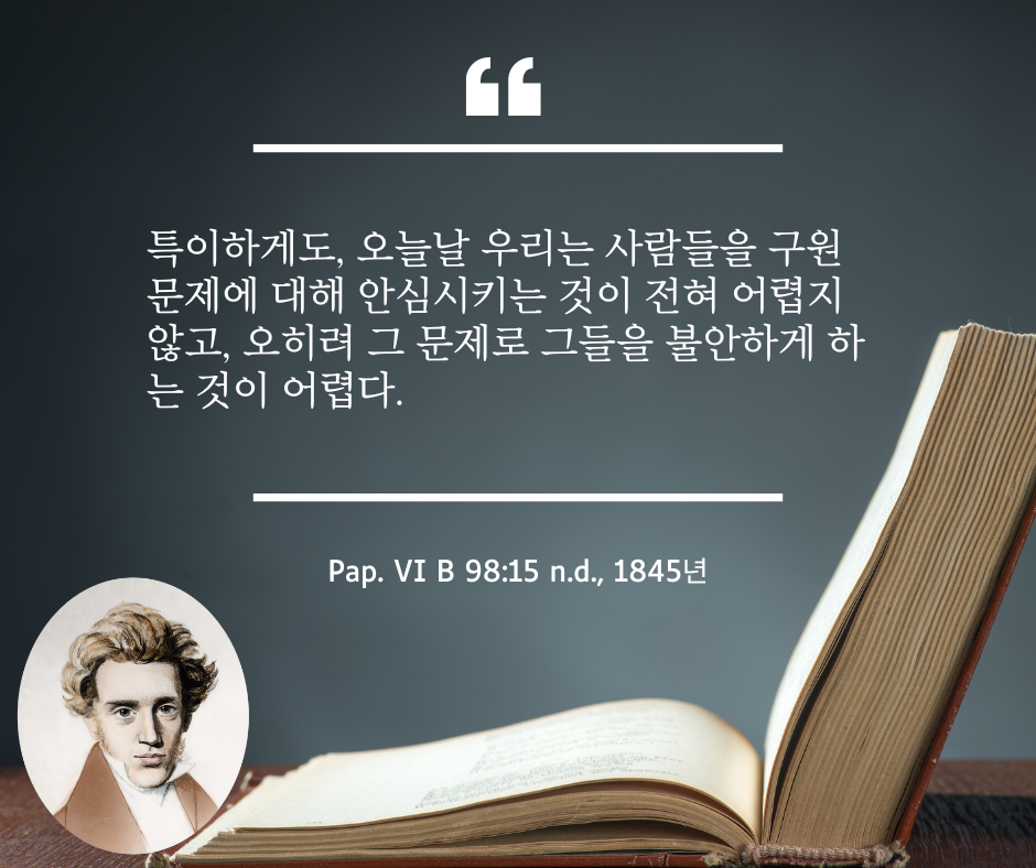 여백에서: ***(특이하게도, 오늘날 우리는 사람들을 구원 문제에 대해 안심시키는 것이 전혀 어렵지 않고, 오히려 그 문제로 그들을 불안하게 하는 것이 어렵다.)-Pap. VI B 98:15 n.d., 1845