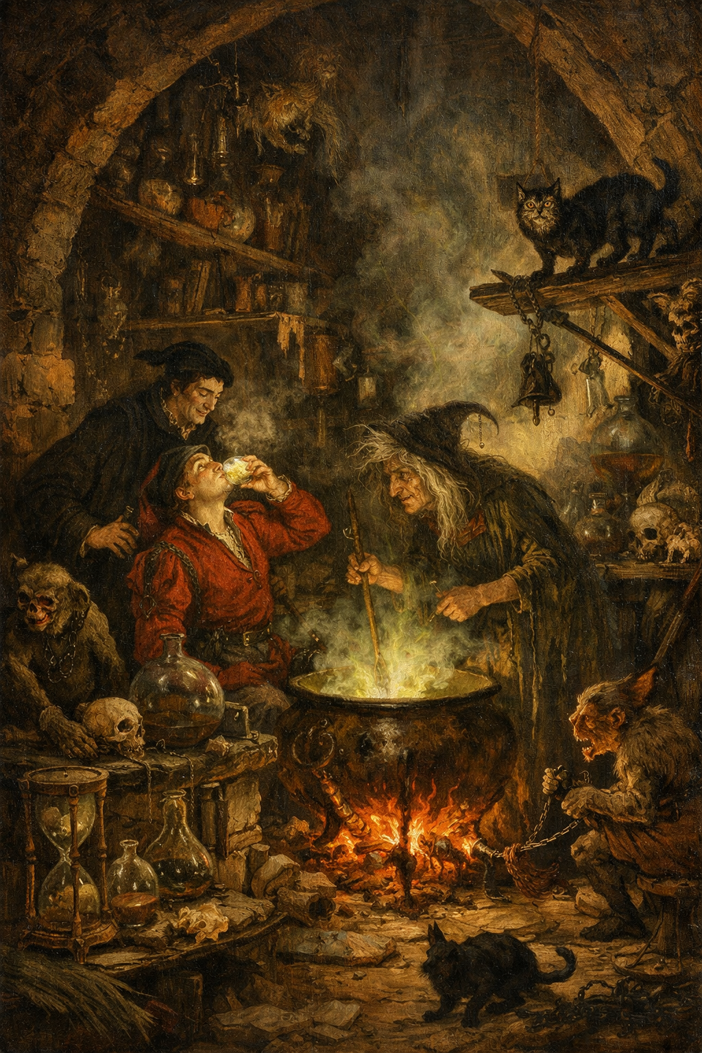 마녀는 파우스트에게 마법의 묘약을 마시게 합니다. 이 묘약은 단순히 외모를 젊게 만드는 것이 아닙니다.